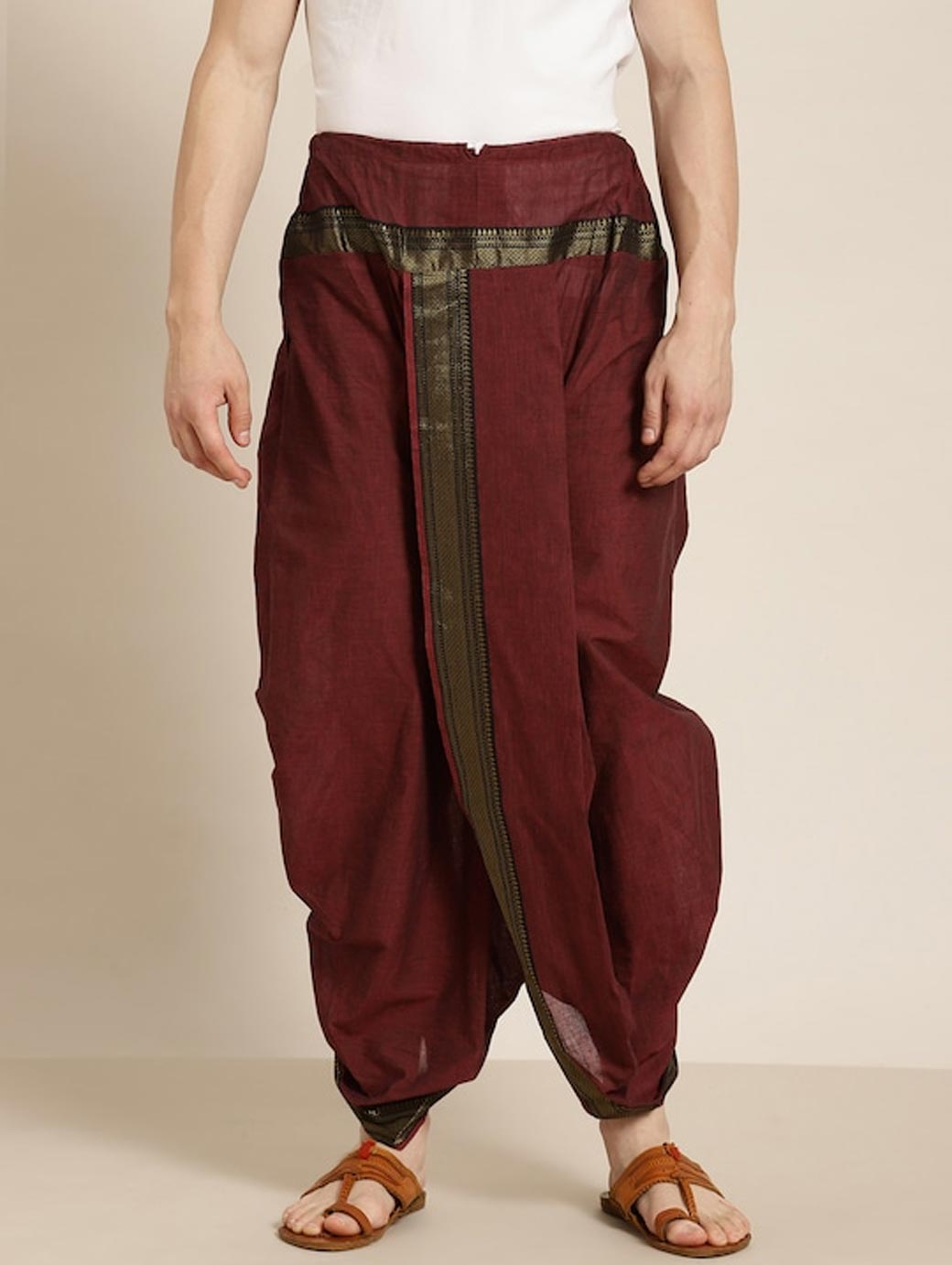 Burgundy solid dhoti pants with border detail, has a drawstring closure