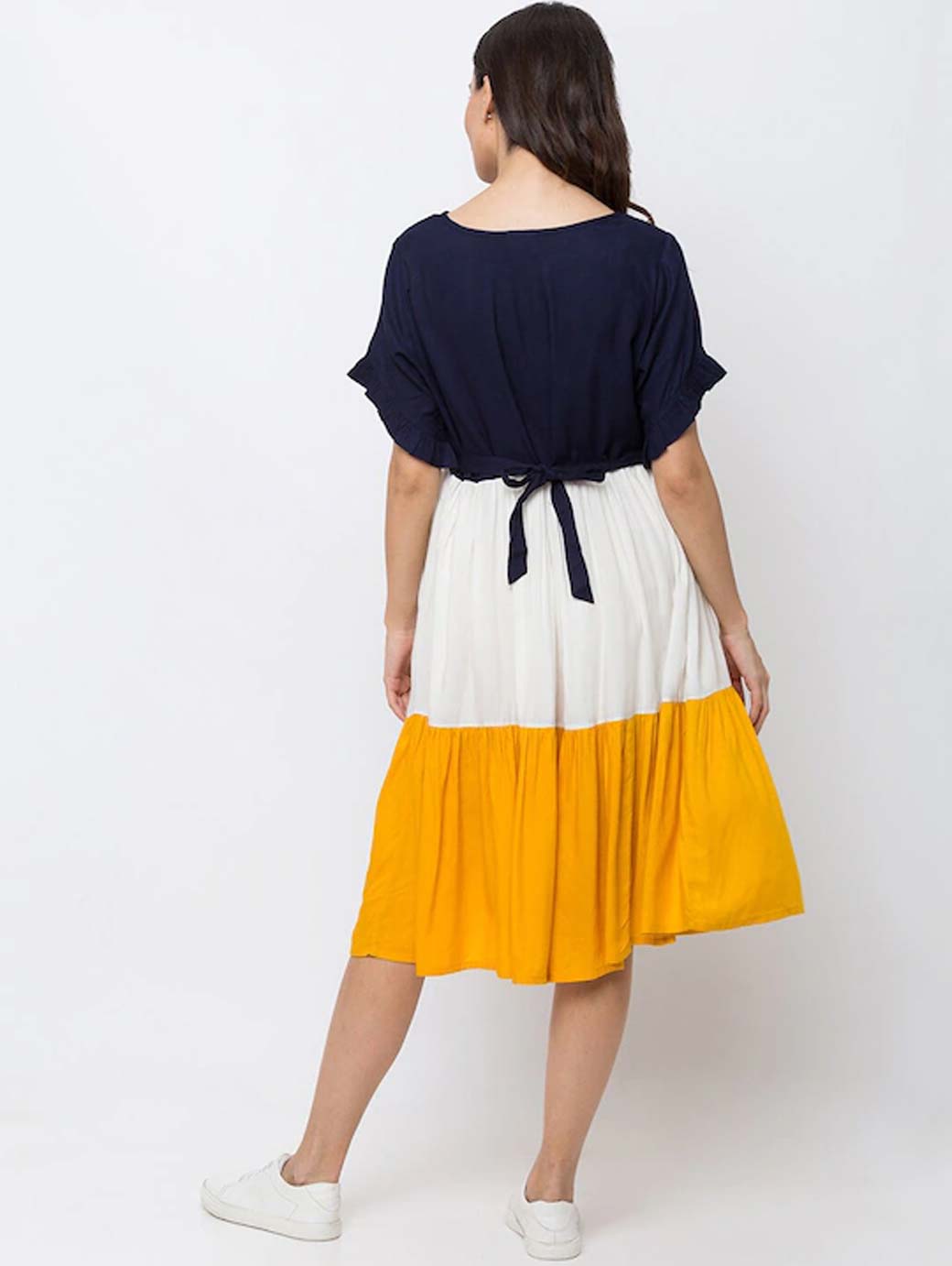 Navy Blue and White colourblocked knitted Nursing fit and flare dress, has a round neck, short sleeves, concealed zip closure, and flared hem