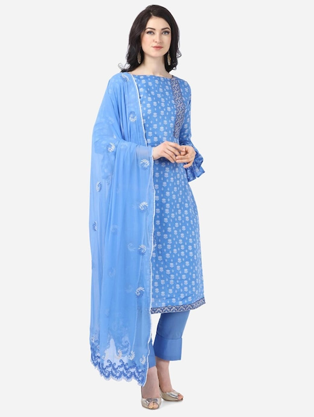 Blue and white printed unstitched dress material