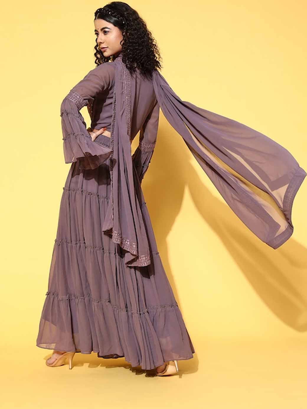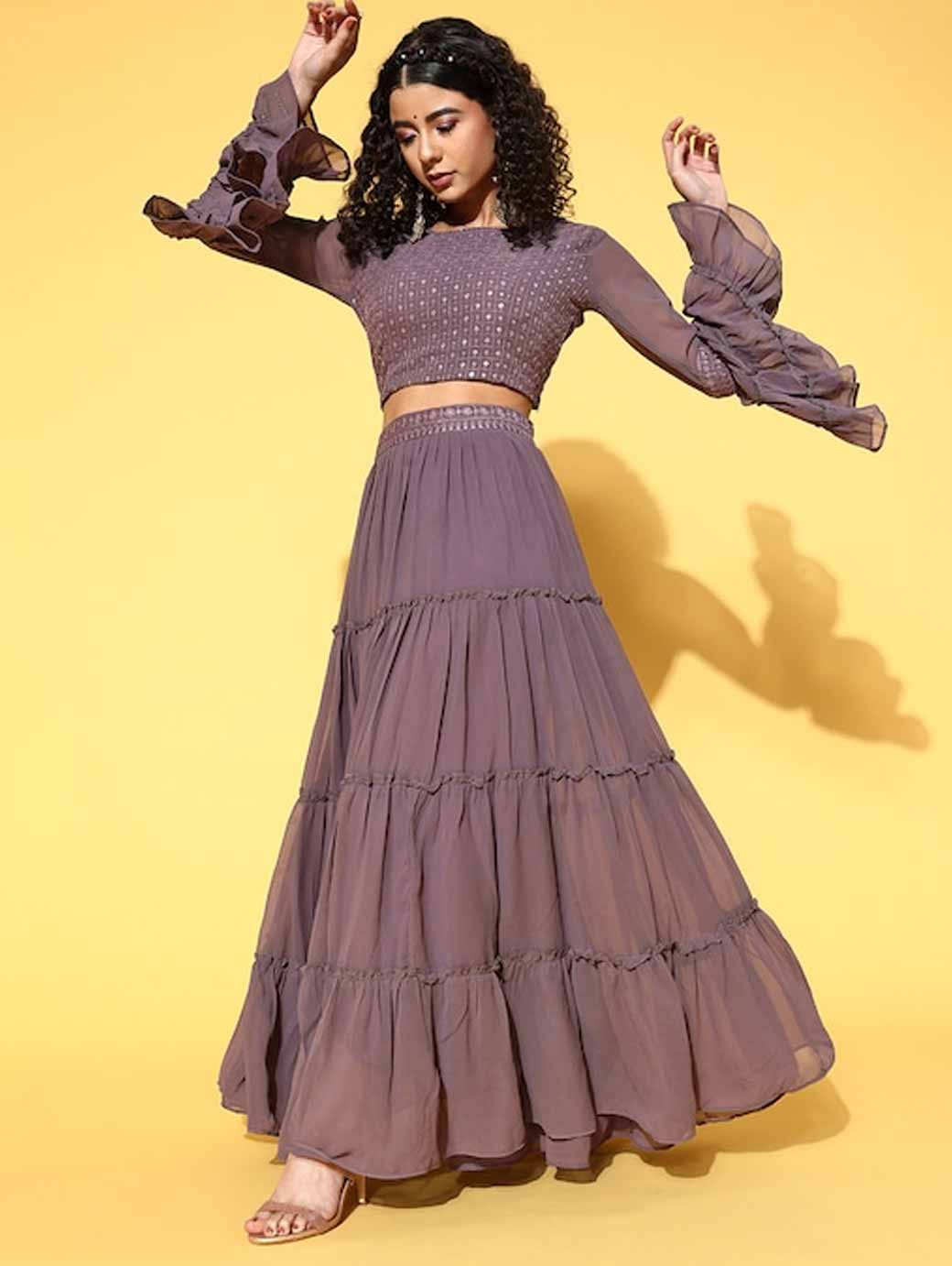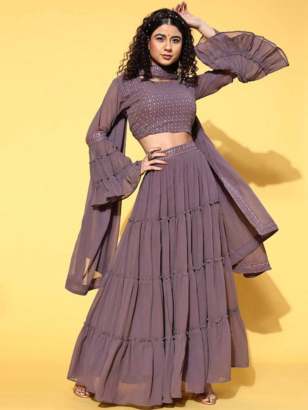 Purple and white printed unstitched blouse, has a round neck, sleeveless, purple and white printed semi-stitched lehenga, flared hem