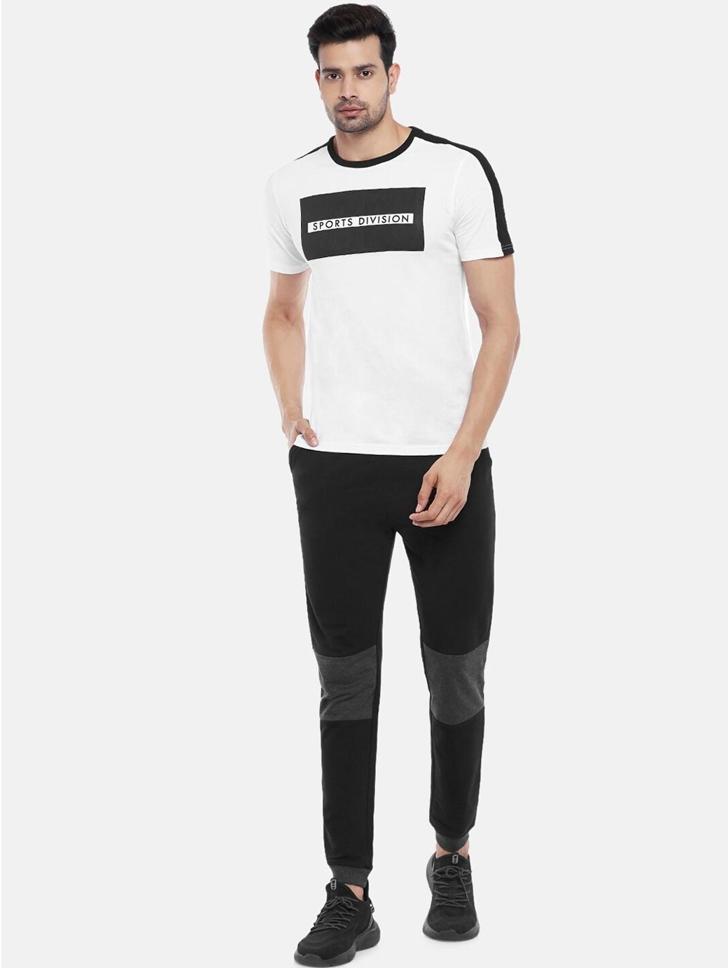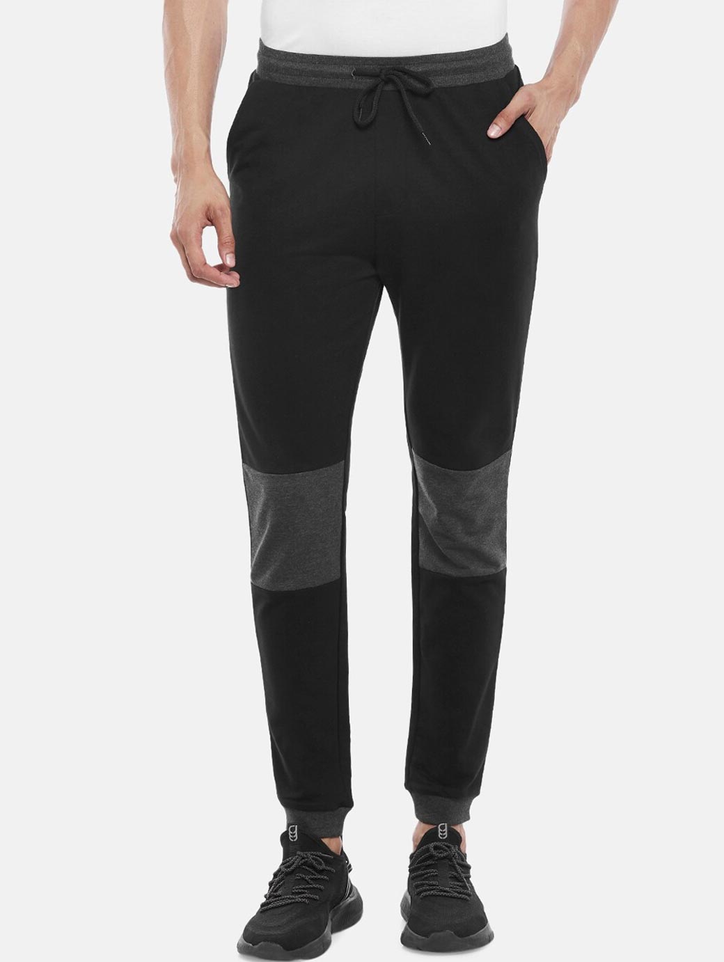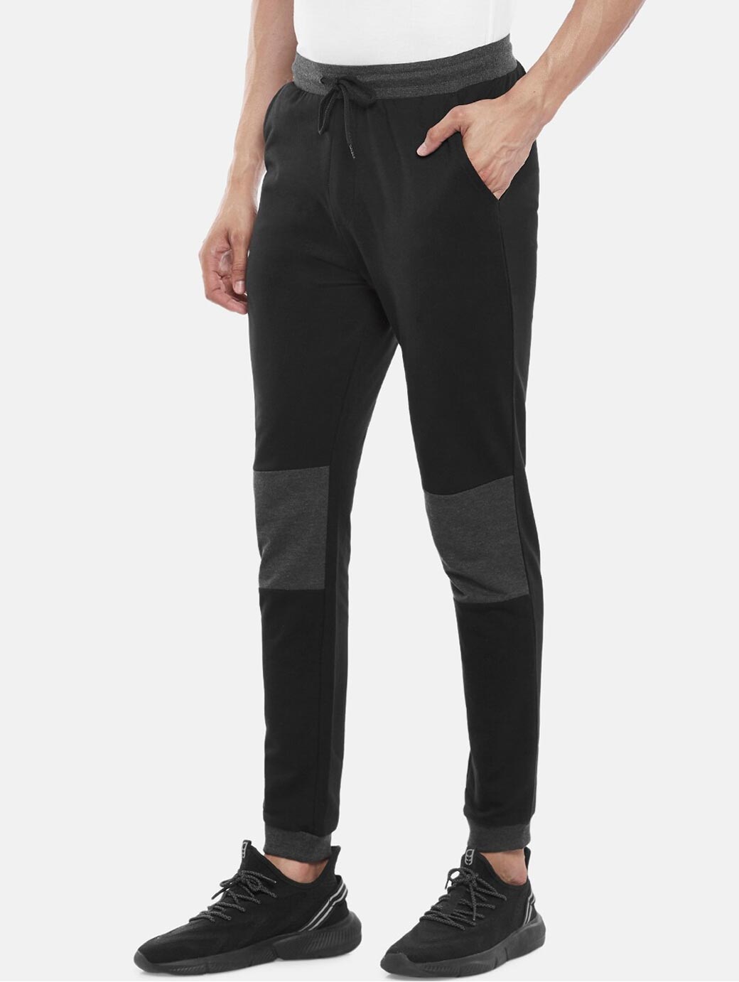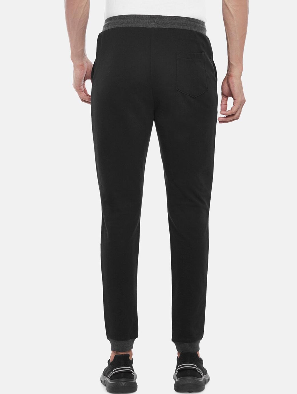 A pair of black solid slim fit joggers, has an elasticated waistband, 3 pockets and cuffed hems