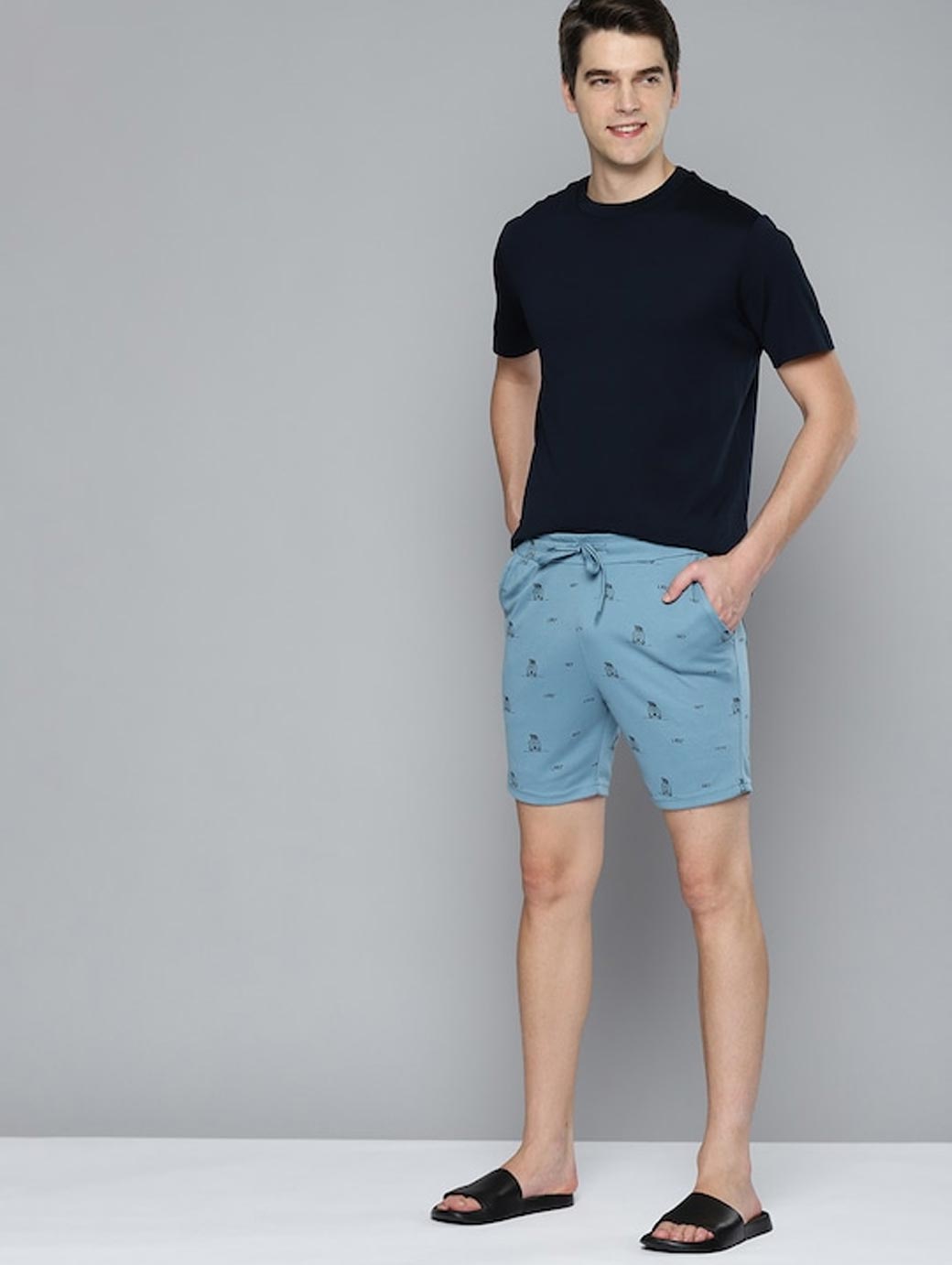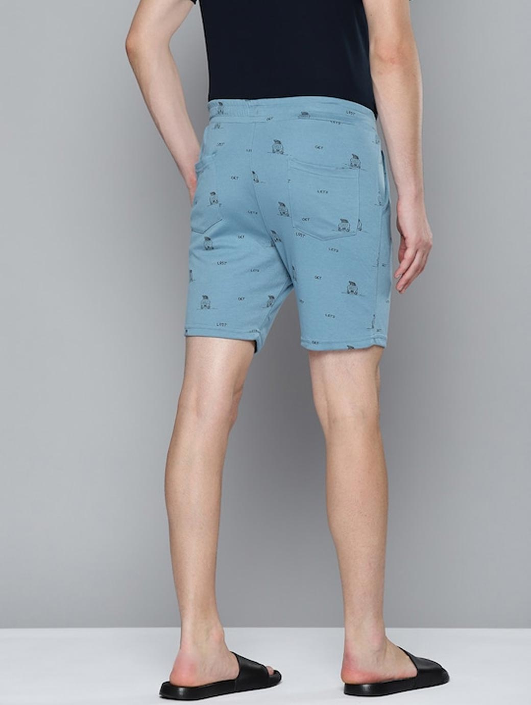 A pair of blue mid-rise printed knitted lounge shorts, has inner elastic waistband with drawstring closure, 4 pocket