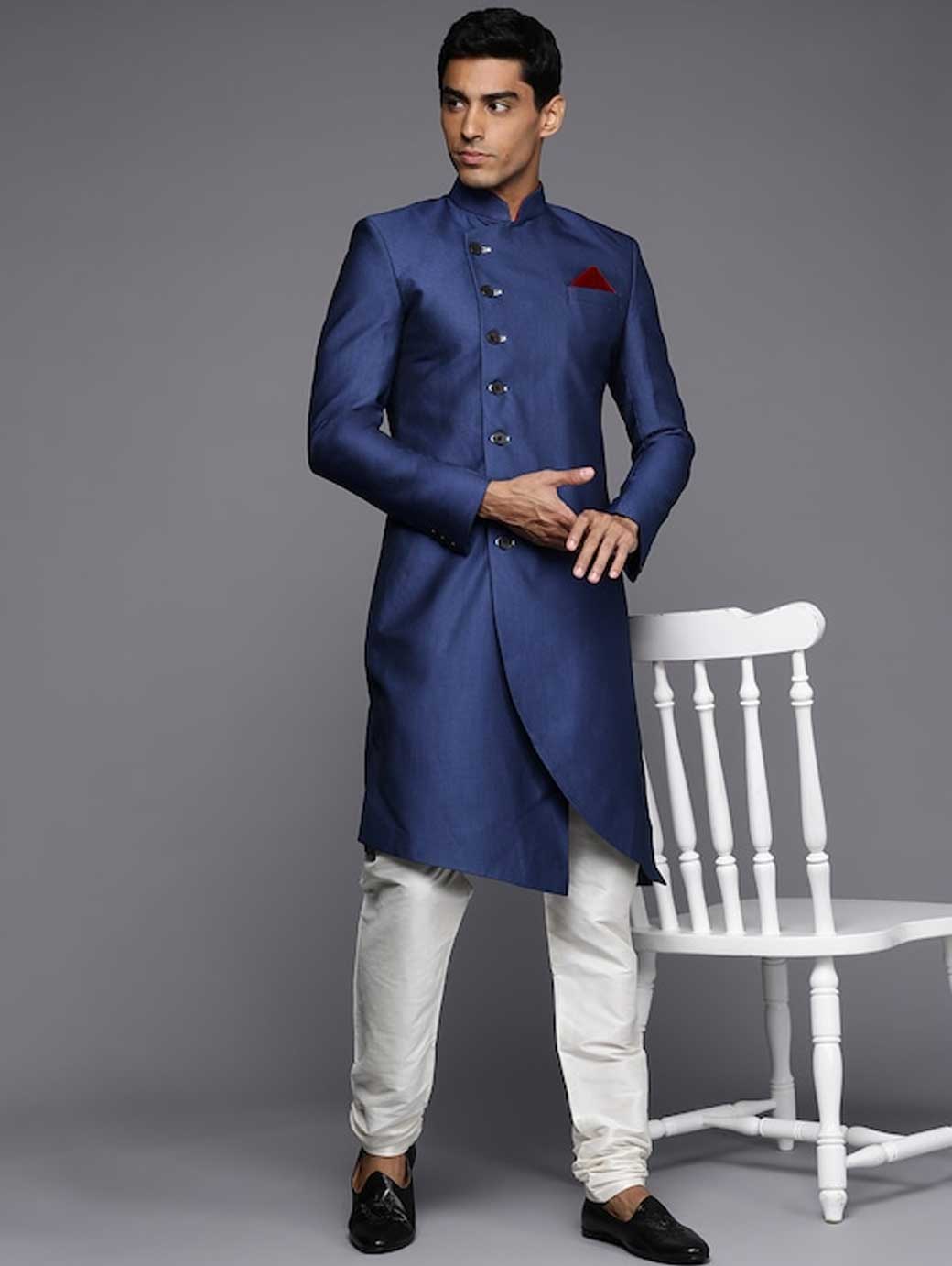 Navy blue and off white sherwani set Navy blue sherwani, has a stand collar, long sleeves, full button placket on the front Off white solid churidar, has a drawstring closure