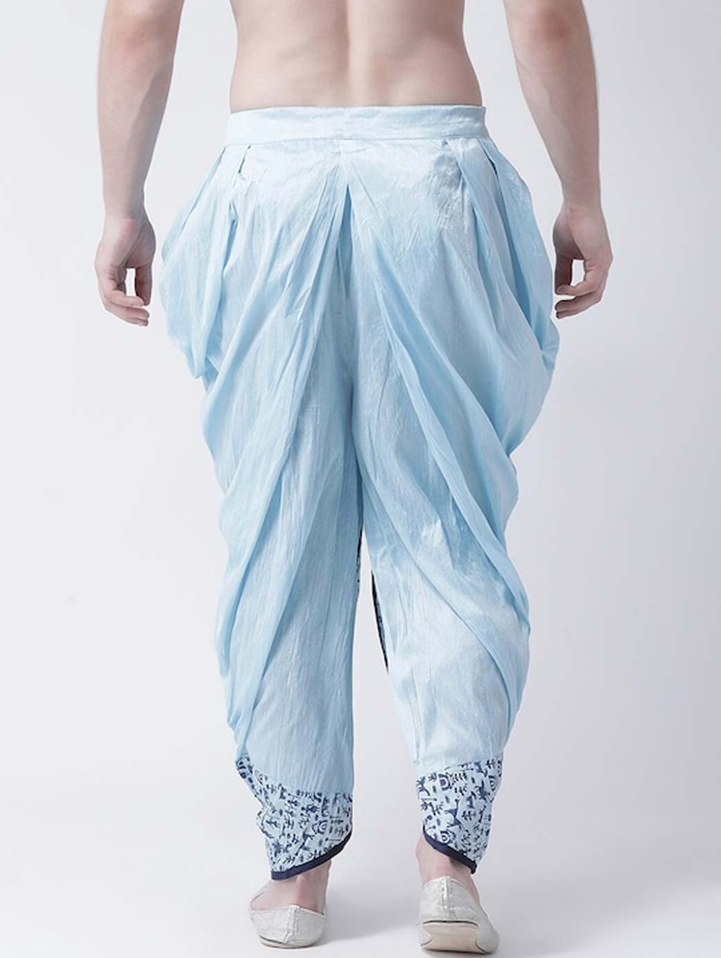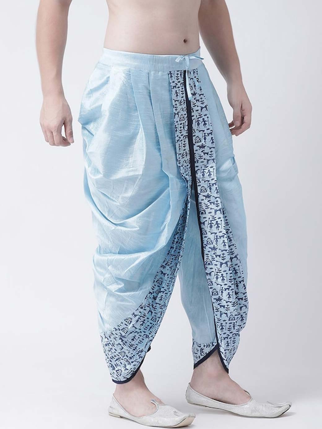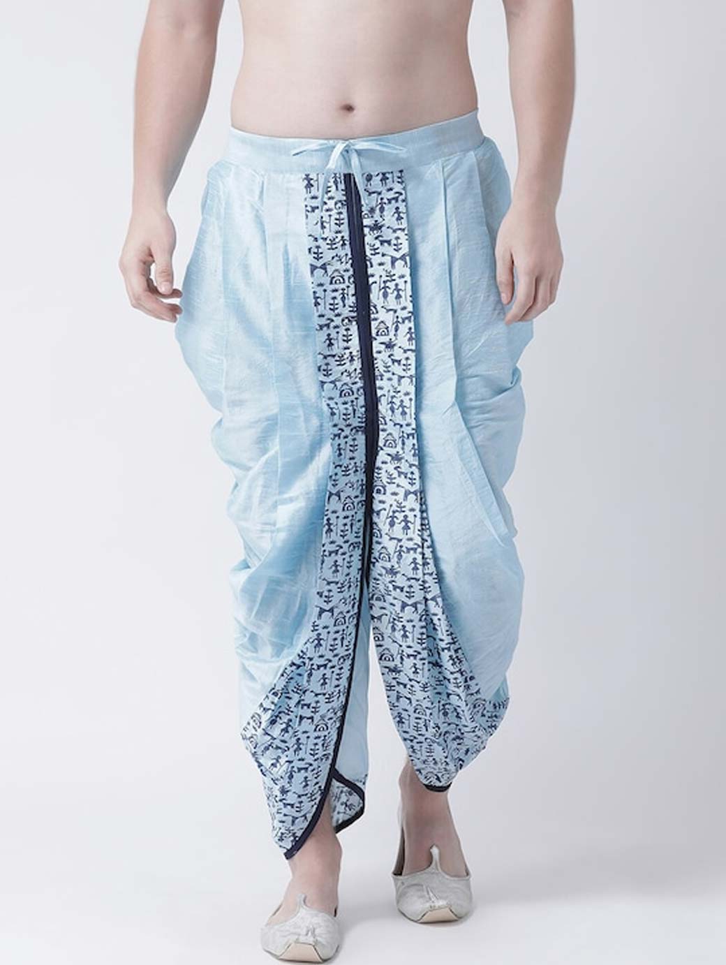 Blue printed regular-fit dhoti pants with printed detail in front and back, has gathers and pleats, and an elasticated waistband with a drawstring fastening Disclaimer: Product color may slightly vary due to photographic lighting sources or your monitor settings