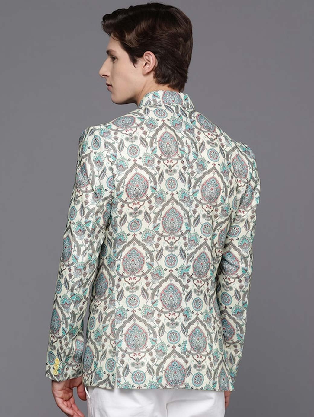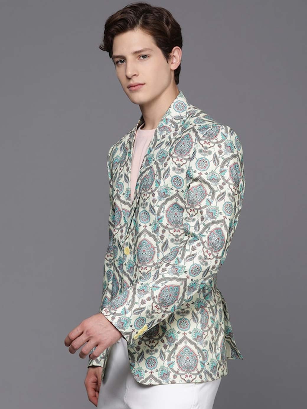 Cream Coloured and green Cotton Blend Printed Blazer, has a notched lapel collar, single-breasted with double button closure, long sleeves, three pockets and double vented back hem