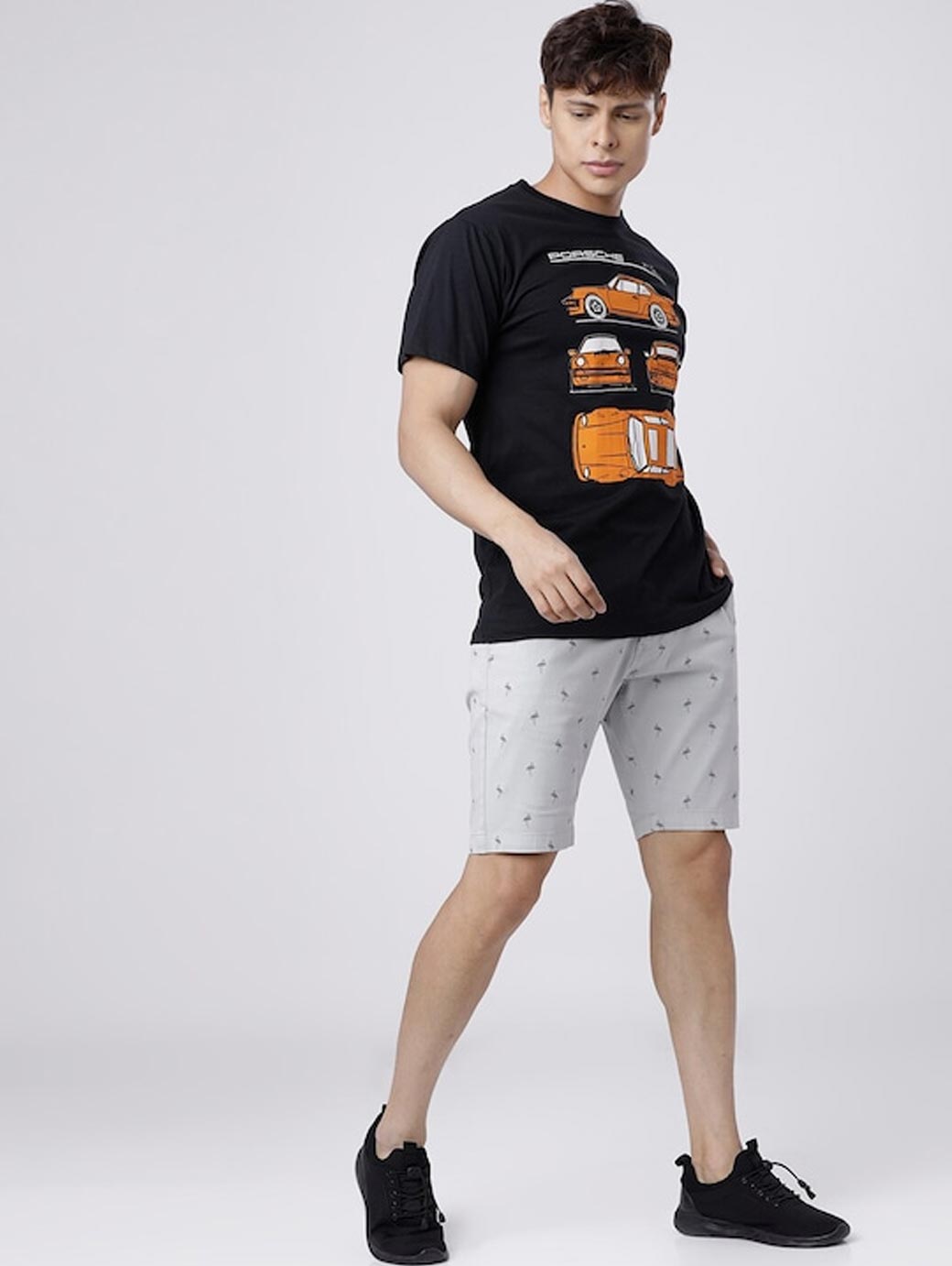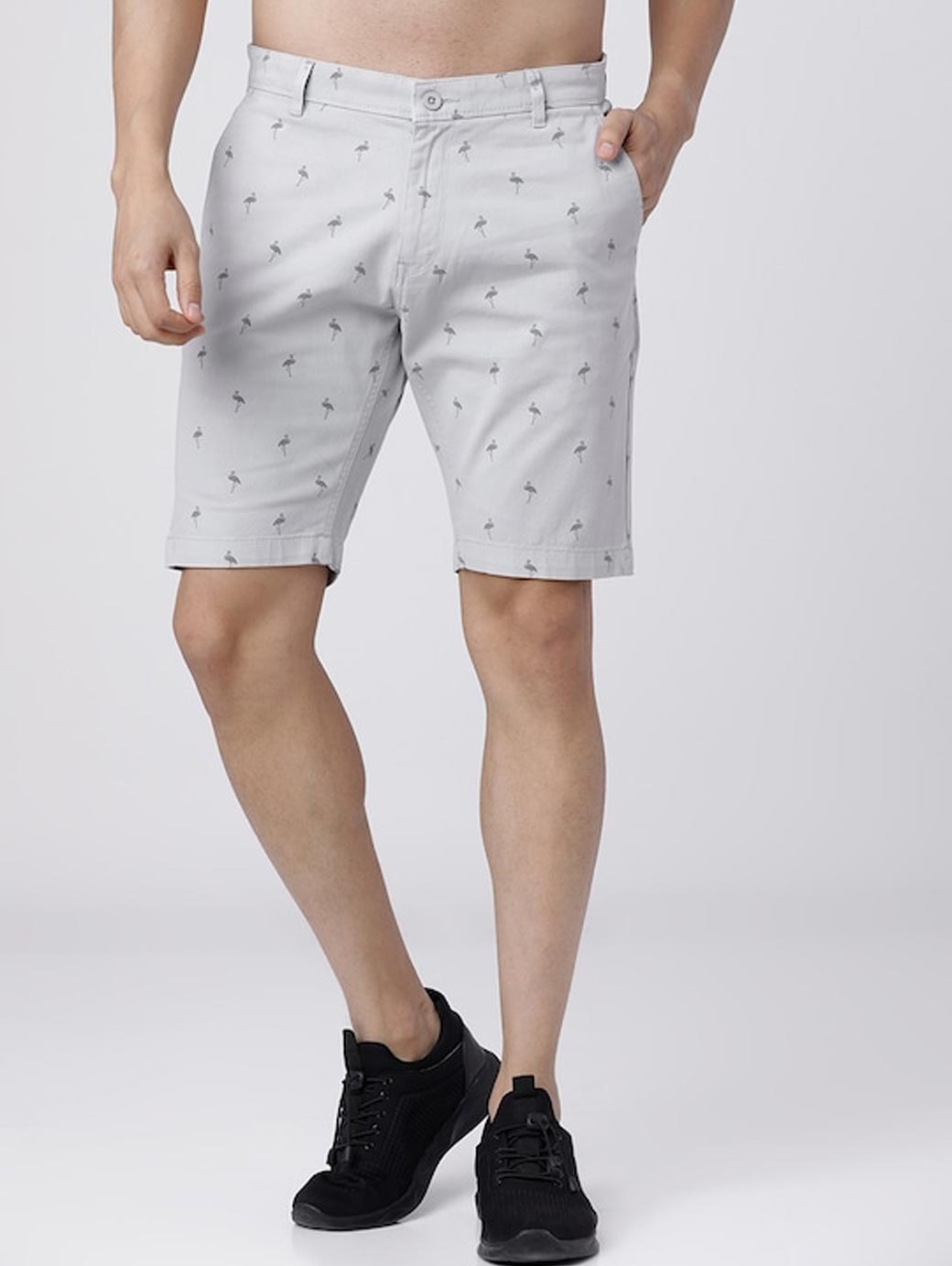 These trendy grey printed shorts will help you set the tone for this season. This grey pair can be worn with a classic T-shirt and canvas shoes for a casual night out on the town. Grey printed mid-rise chino shorts, has 4 pockets, and button closure.