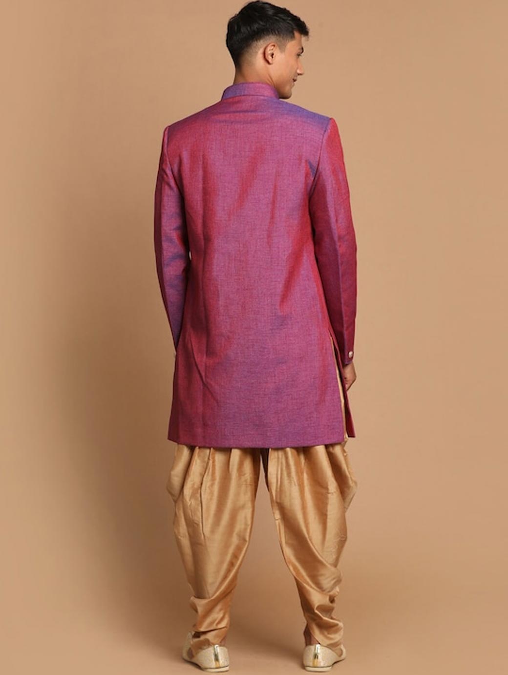 Purple woven-design sherwani set, has a mandarin collar, full-front button placket, long sleeves, a straight hem, and multiple slits Rose Gold-coloured solid, has an elasticated waistband with drawstring closure