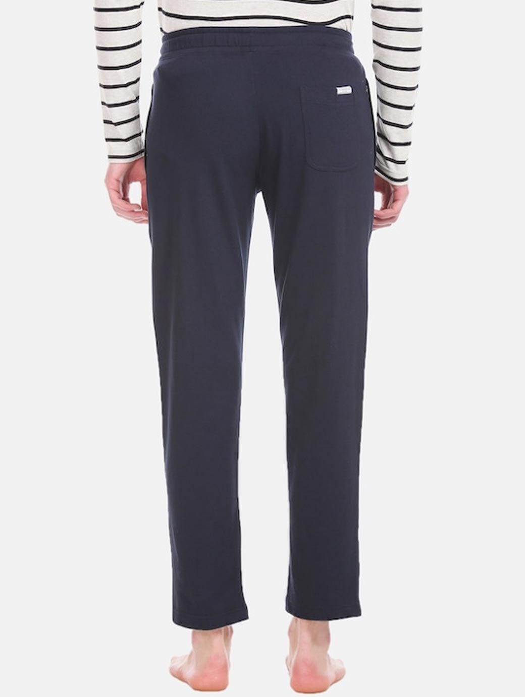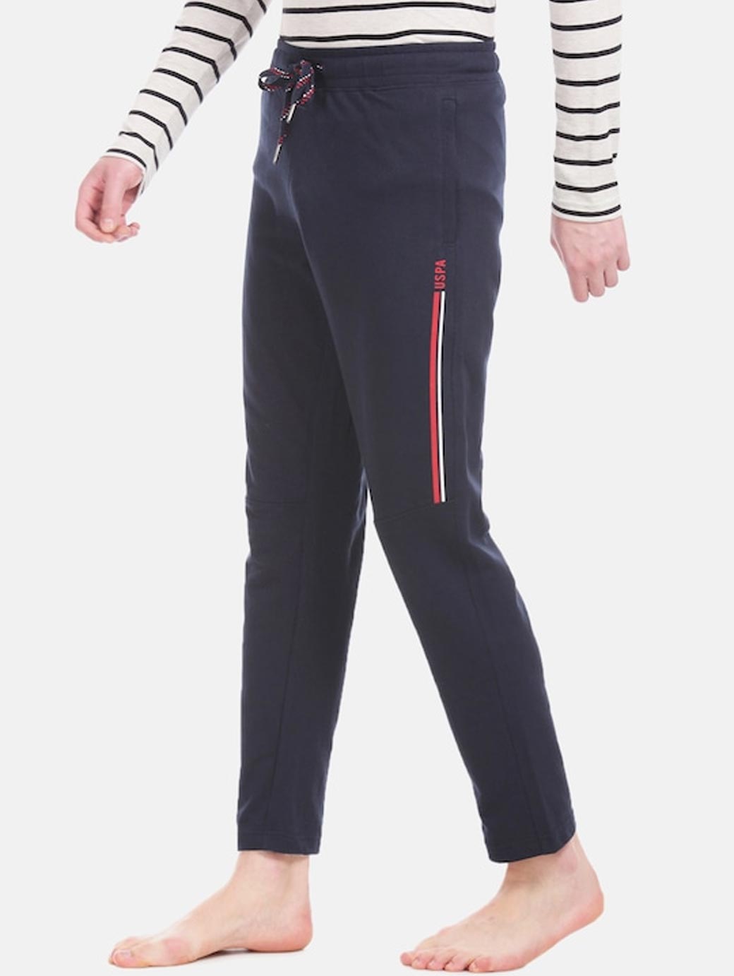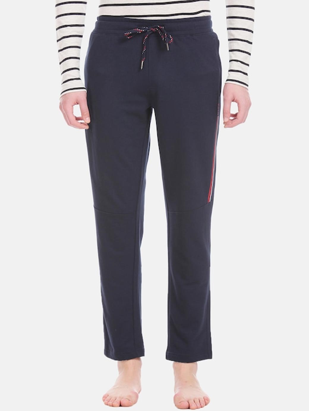 Navy blue striped track pants, has drawstring closure and 3 pockets