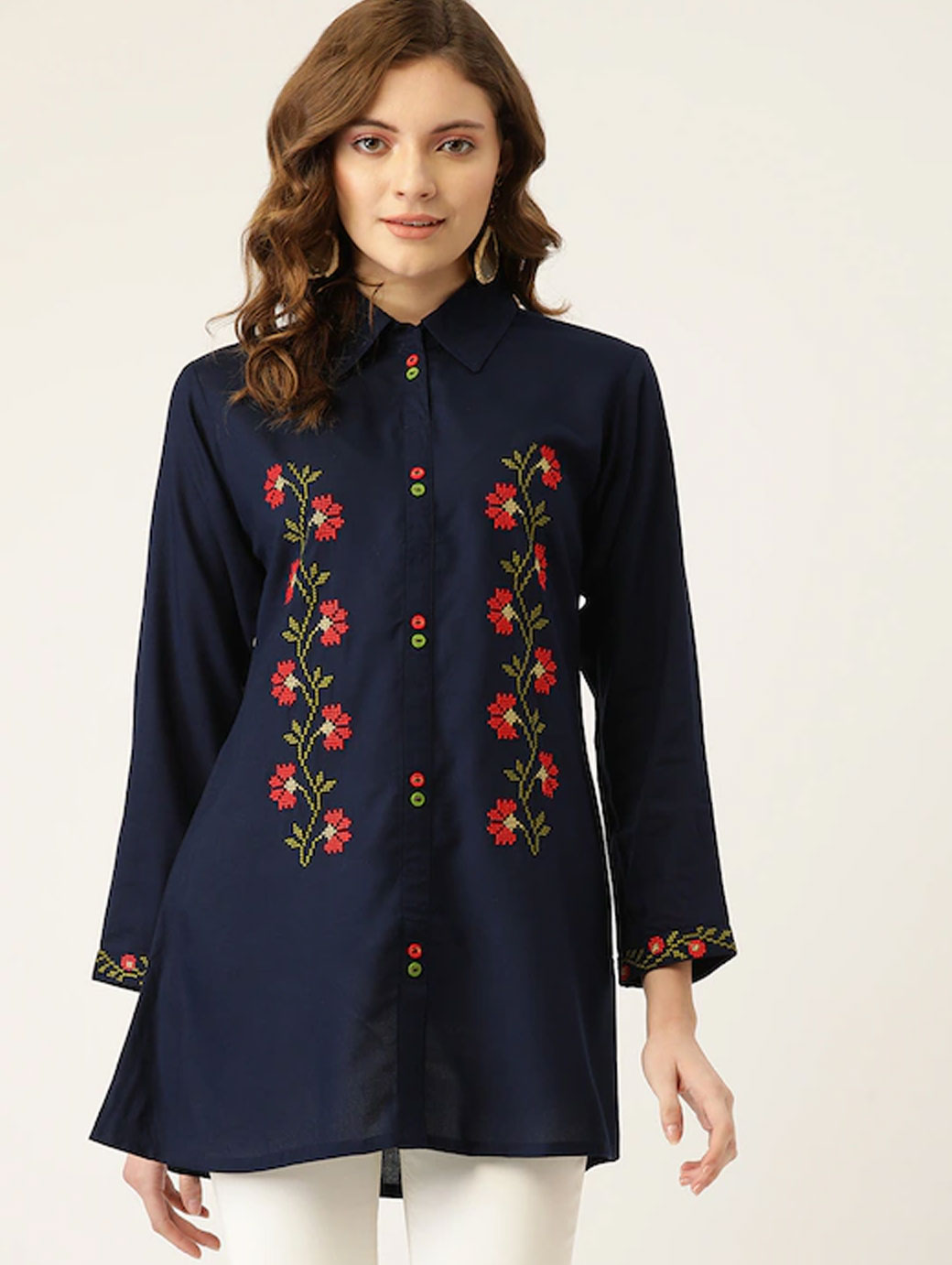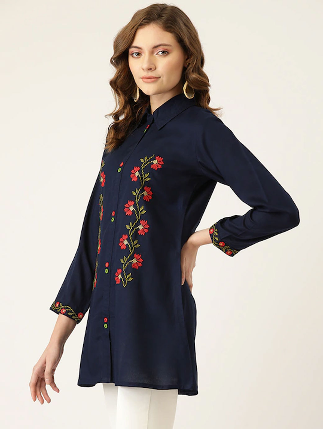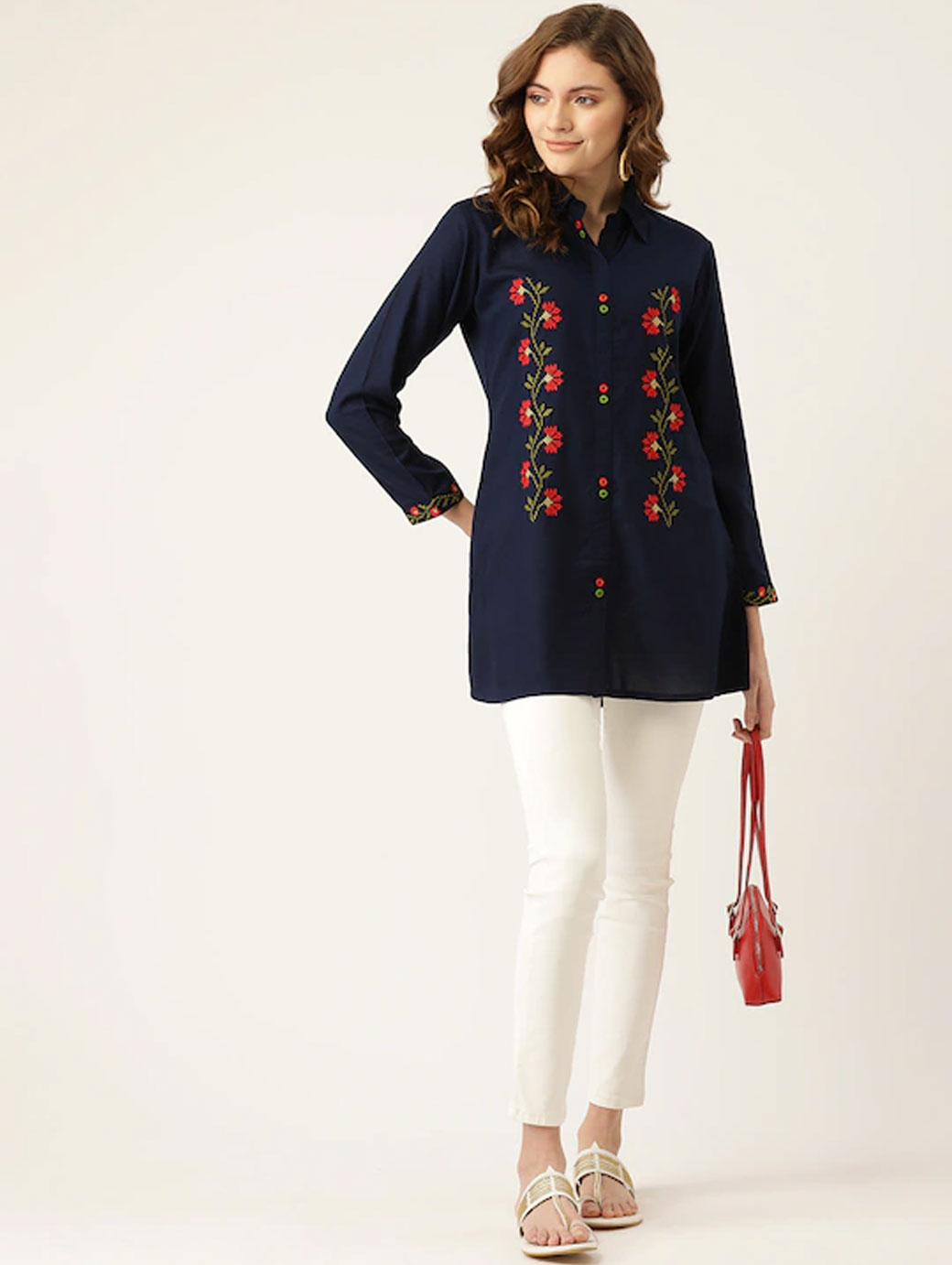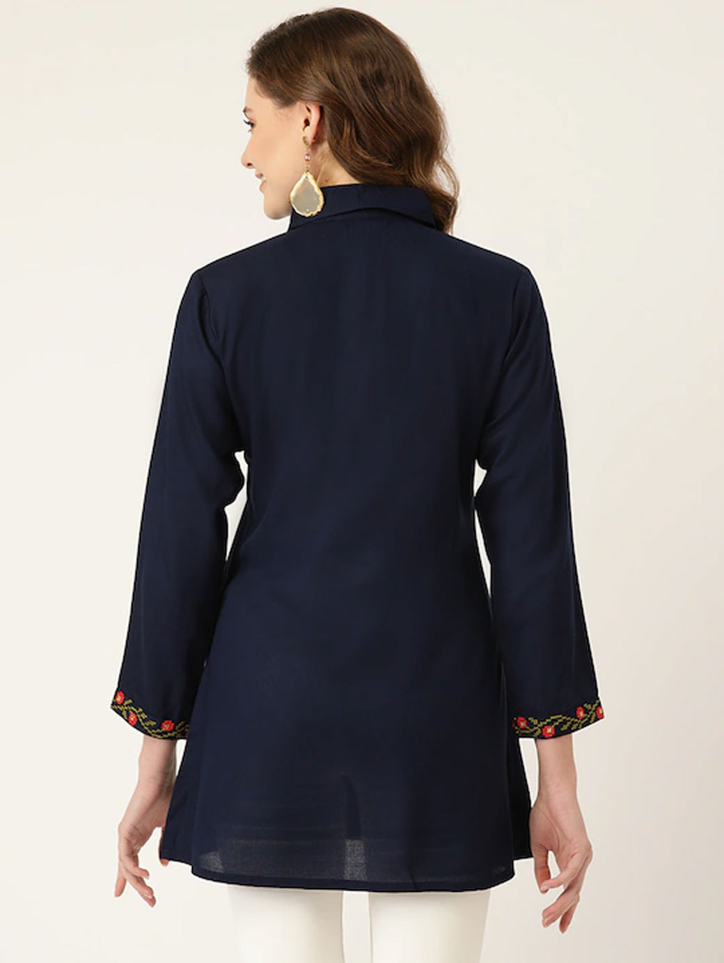 Navy blue embroidered tunic, has a shirt collar, three-quarter sleeves, embroidered detail.