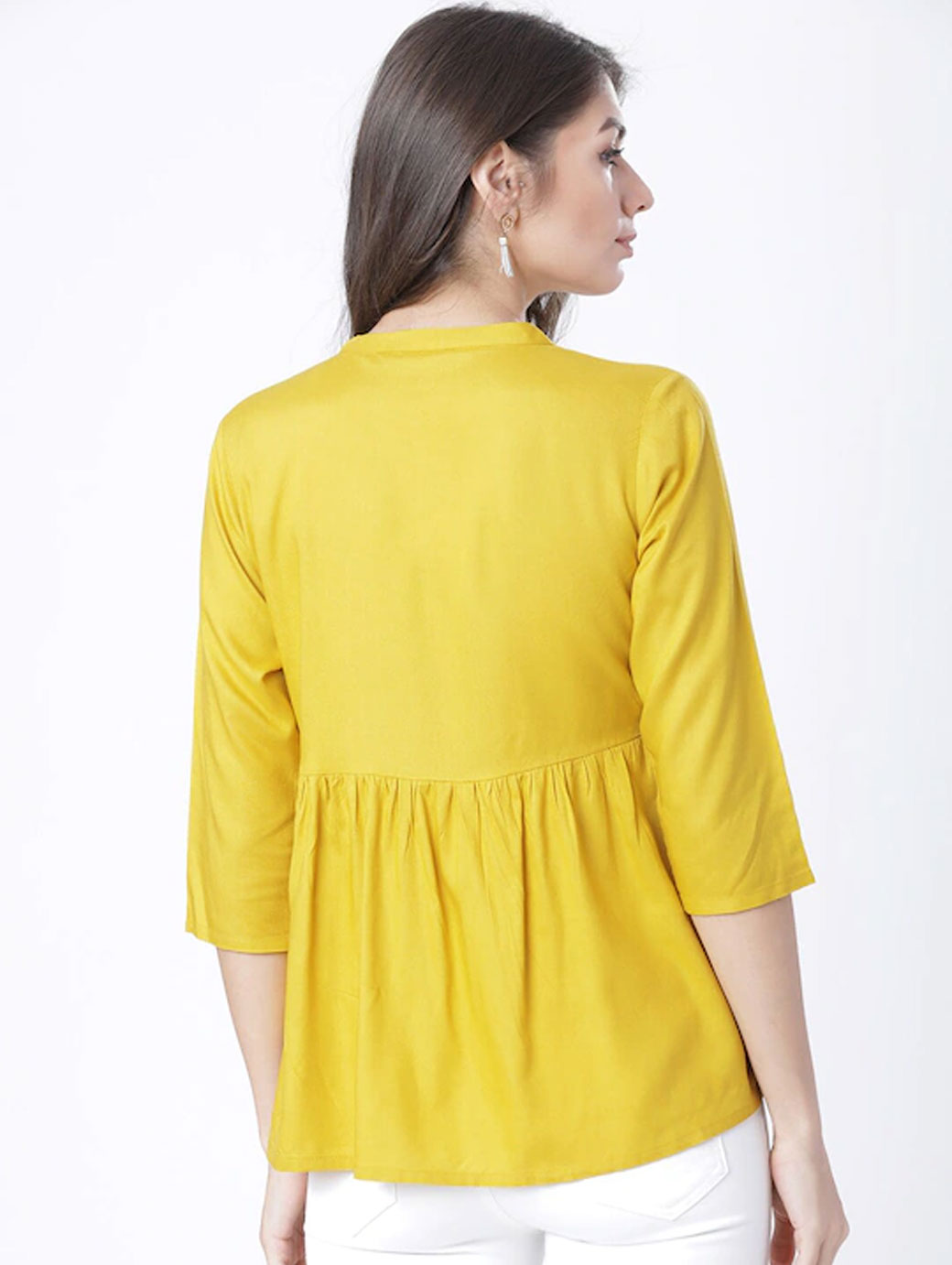 Mustard regular a-line Top printed woven round neck three-quarter sleeves , regular sleeves sleeves gathered or pleated 2021 hem button.