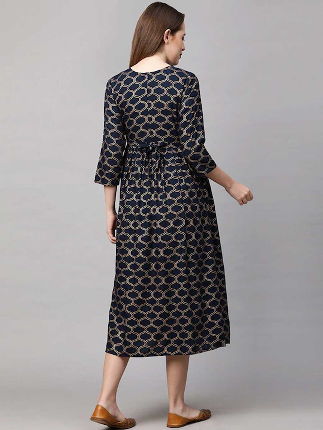 Navy Blue & Gold-Toned Geometric Printed Maternity Nursing A-Line Midi Dress