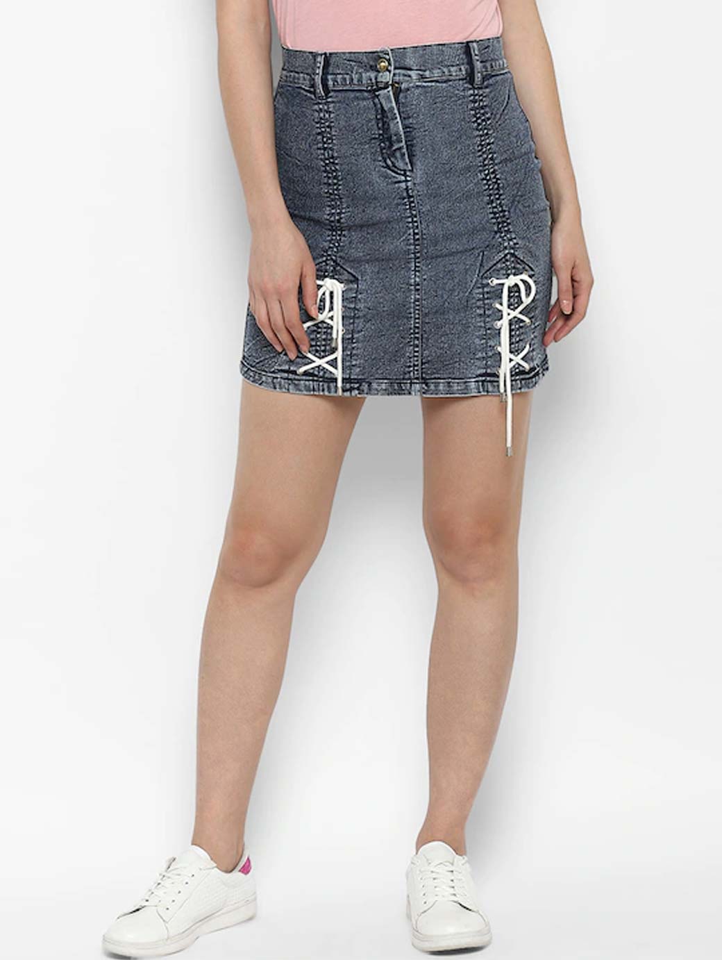 Blue washed mini A-line denim skirt, has a waistband with belt loops, button closures