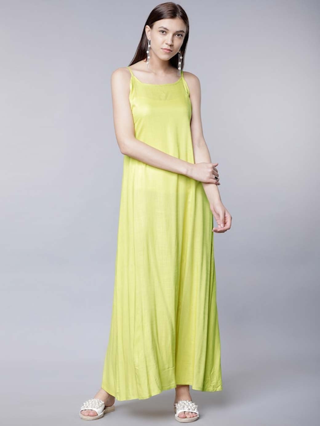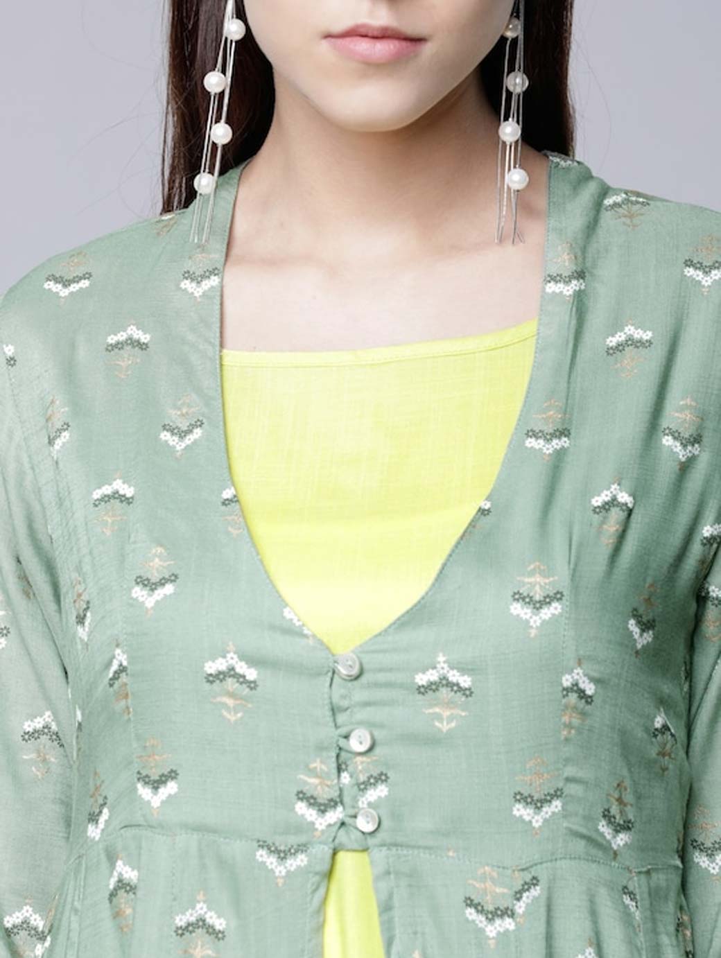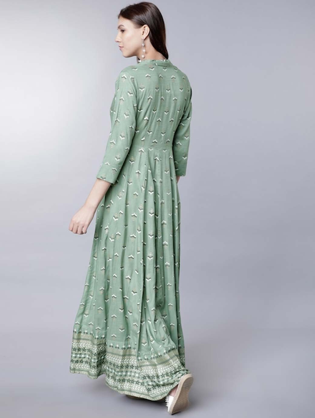 Green solid woven maxi dress, has a V-neck, three-quarter sleeves, button closure, an attached lining, flared hem Comes with an open front jacket