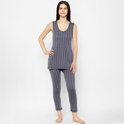 Grey striped thermal top, has a scoop neck, and sleeveless