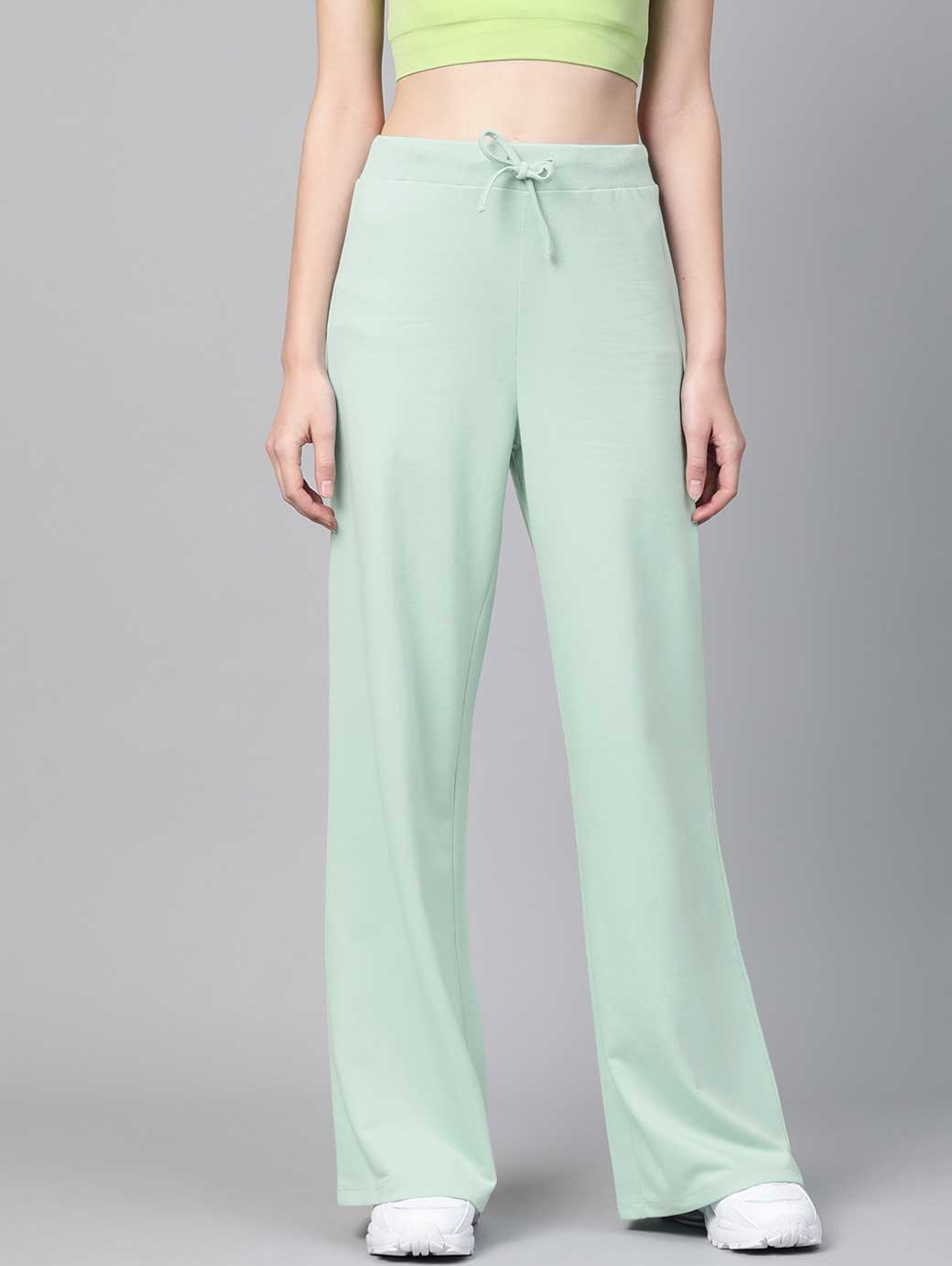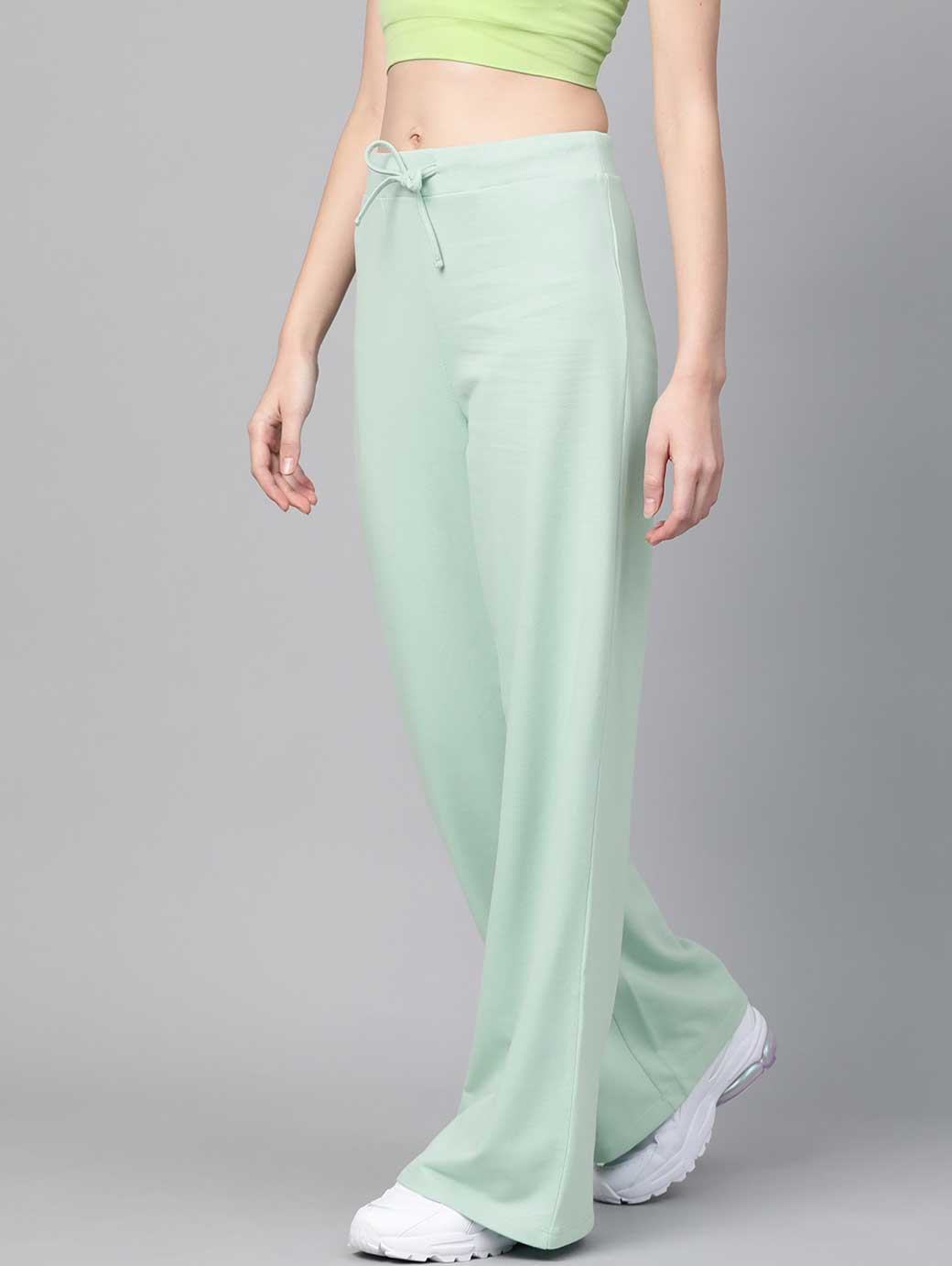 A pair of mint green solid wide leg track pants, has an elasticated waistband with outer drawstring closure