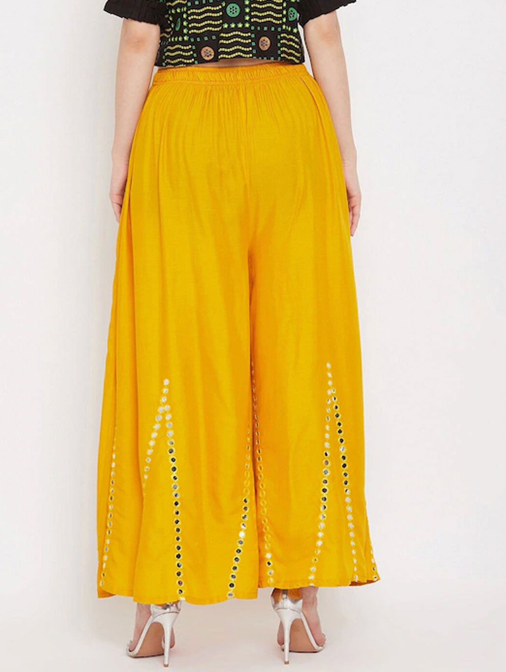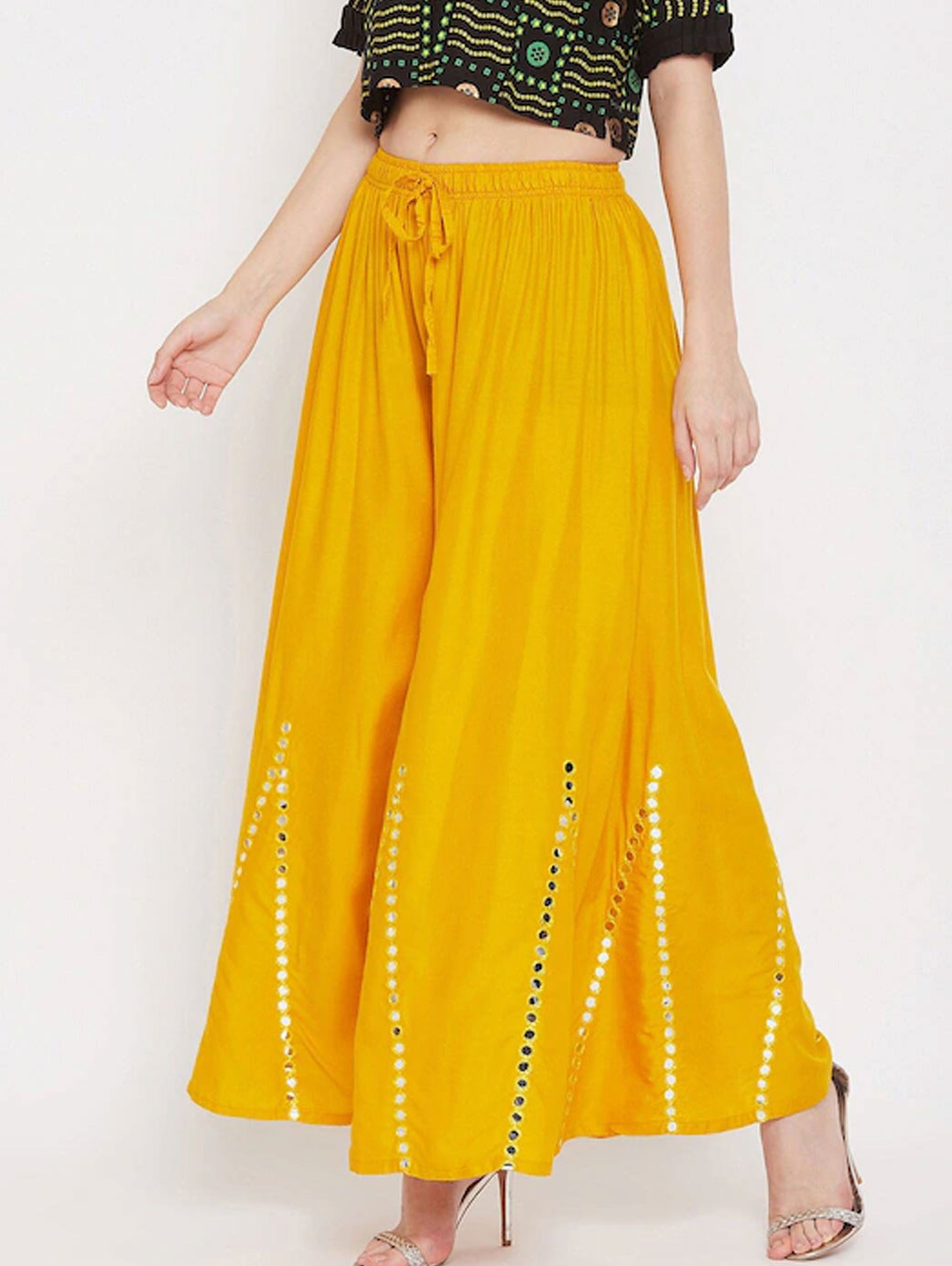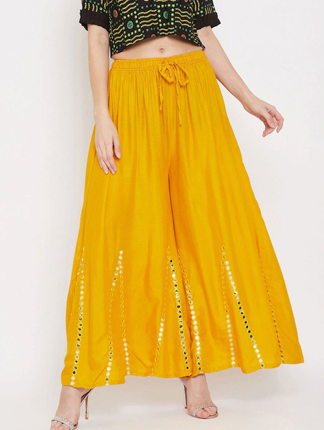 Mustard yellow knitted palazzosSolid embellishedOpaqueStraight fitElasticated waistbandLength: regularKnitted viscose rayon fabric